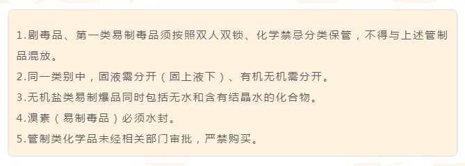 目前,许多实验室对危险化学品的分类存放要求存在理解不到位、执行随意的情况,导致混放现象很多,安全隐患严重,特别是一些实验室将易制毒品放一个柜子、易制爆品放一个柜子,是不合适的。其实,分类存放最关键的是要考虑配伍禁忌。因此,我们从防盗、配伍禁忌不能混放的角度出发,提出了部分管制类危化品的分类存放建议(剧毒品、第一类易制毒品除外的管制类化学品)。